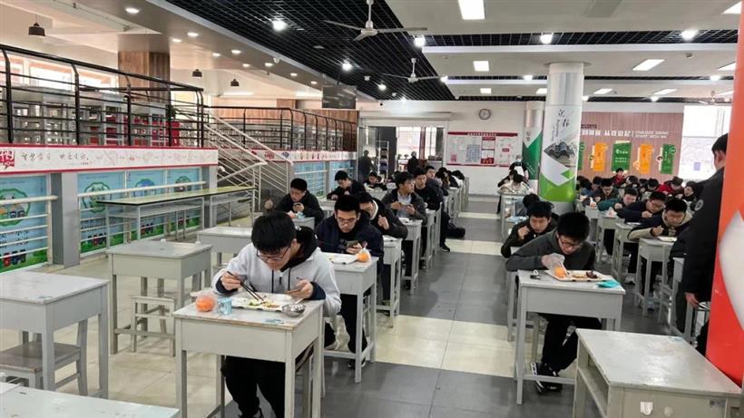 操场上,返校师生进行常态化核酸检测。中午,师生食堂就餐安全有序。
