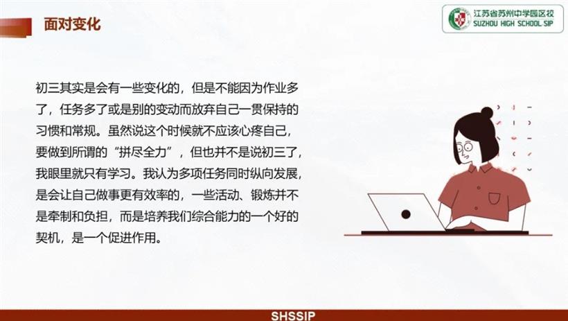 也并不是说初三了,我眼里就只有学习。我认为多项任务同时纵向发展,是会让自己做事更有效率的,一些活动、锻炼并不是牵制和负担,而是培养我们综合能力的一个好的契机,是一个促进作用。