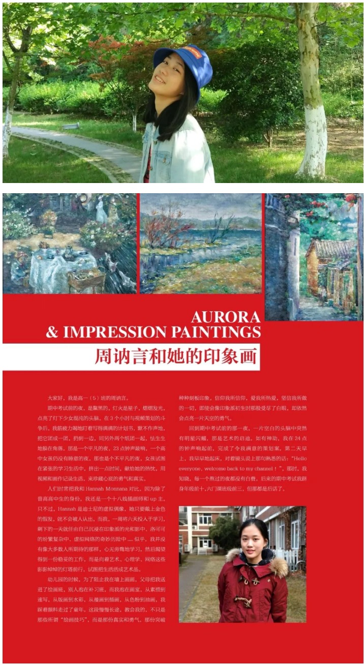 周讷言,我校2020级西马国际班学生。她人如其名,话不多却十分内秀。她是苏州图书馆、苏州太湖马拉松赛事志愿者;也是全国中学生英语能力竞赛全国二等奖的获得者;还是西班牙语A2等级的拥有者。精力不算充沛,爱好却非常广泛。会古筝,吉他,小提琴;擅长芭蕾,游泳;但最喜欢的还是绘画,特别擅长“印象派”绘画技法。