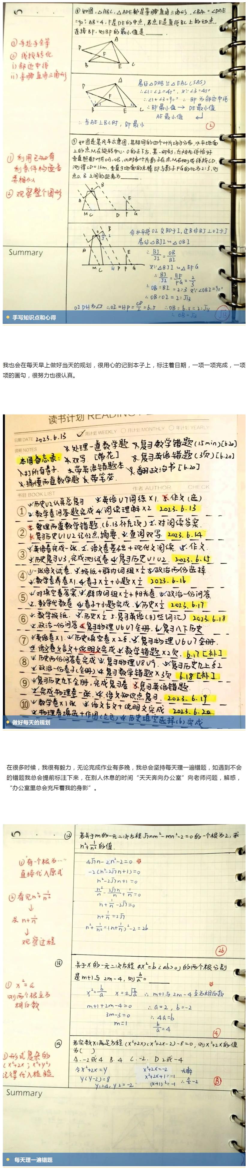 怀着再拼一次的决心,我果断放弃了繁琐的教辅书,转而注重课内。每天充分利用利用下课时间的“黄金十分钟”,本着能会一道是一道的决心,复习并整理本该半小时完成的错题与笔记。那时候,我的笔记本上总是充满着密密麻麻的手写“知识点和心得”。