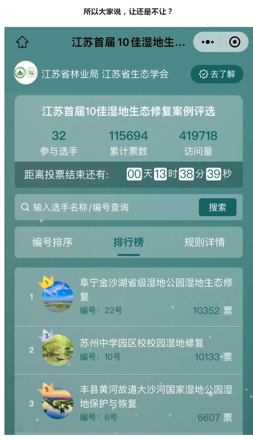 确实,园区校的朋友圈、园区校的家长们那是太给力了。在大家的努力下,昨天上午10点前,在江苏省首届10佳湿地生态修复案例评选中,我们的得票数就从第四又拉升到了第二,到了下午,更是满满的动能啊,迅速实现反超,重回第一的位置。小编忍不住在朋友圈里写下“这就是园区校速度”“这就是园区校人的力量”这样由衷的感叹!