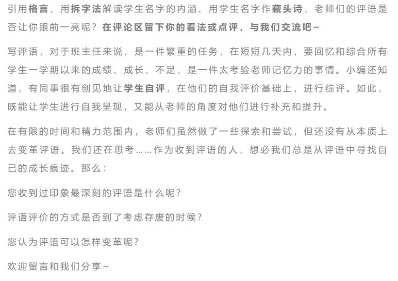 要说人物品评,那可是由来已久,它是汉魏六朝士族社会最重要的文化风尚之一。而今,人物品评以评语的形式延续在现代教育之中。但是随着经济的发展、社会的变迁,教育理念发生了很大的变化,也带来评价标准、评价方式的改变。传统“评语”还需要继续下去吗?如何继承与创新相结合,实现新的突破?