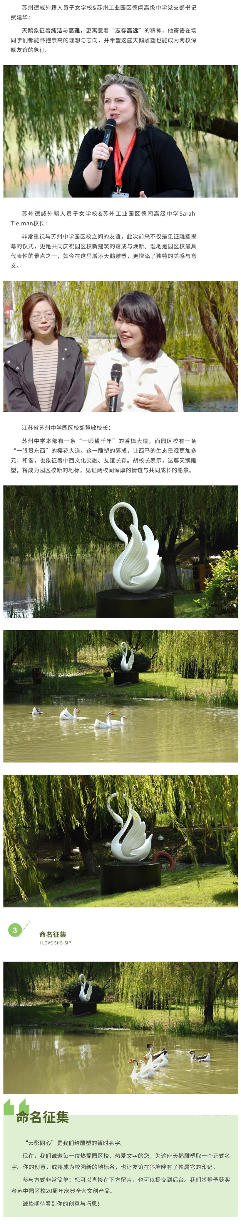 这座由苏州德威外籍人员子女学校&苏州工业园区德闳高级中学赠予的天鹅,静静伫立在湿地之畔,象征着纯洁、高雅与志存高远。它不仅是西马斜塘“云影”的延伸,更承载着两校“同心”的情谊与祝福。